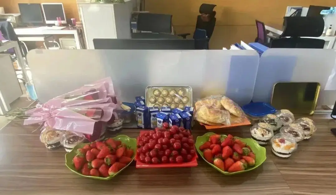 “一束鲜花献真情,一张礼卡表祝福”,还有心灵手巧的女同事亲手做的甜品蛋糕投喂。